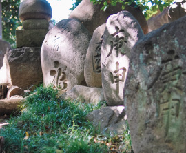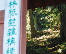 雲辺又有一重関(雲辺又た一重の関有り)をくぐると女坂からだらだら坂であがれます。総門を入ると左手に跳ね返り不動跳ね返り不動はその昔本堂裏に遷座したことがあったのですが、不思議なことに一夜で元の場所に戻っていたので、それ以来、村人は跳ね返り不動と呼び篤く信仰してきました。 や大石段の途中右手に禁牌石禁牌石には「不許葷酒入山門」と刻まれて「葷酒山門に入るを許さず」と読みます。「葷」とは韮・大蒜・葱などの匂いの強い野菜で、葷や酒は山門内に入ってはいけないと禁止する表示です。この石碑は享保4年に第2代目天湫和尚によって建てられました。があります。