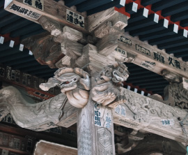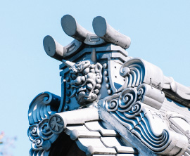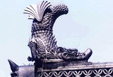 摩伽羅は名古屋城の金の鯱に似ていますが、尾ひれがありません。これはインドの伝説上の動物でガンジス河の女神の乗り物で、そこに棲むワニをさすといわれています。ワニは水辺の動物で一番強く聖域、浄域の結界を守るために守護神として屋根で見張っているのです。をのせているのと聯聯は対聯ともいい、柱や壁に対になる詩を掲げるもので、この聯はこの寺を開山した東皐心越禅師の書で、隷書体で書かれています。