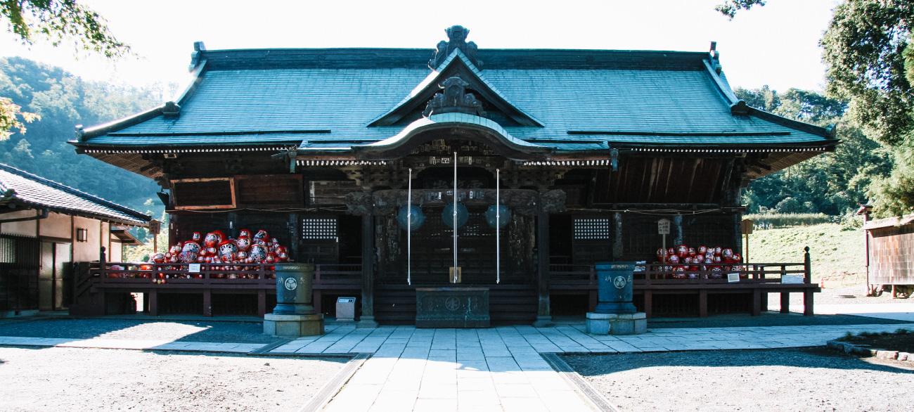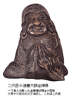 達磨寺ができる由来となった一了居士の彫った達磨大師坐像は旧本堂(現在の放生池の所)の横の達磨堂にお祀りされていましたが、明治14年6月16日の火災で本堂・達磨堂等、現観音堂を除いて全て消失してしまい、烏有に帰してしまいました。現在、達磨堂の中央に本尊として祀られているの達磨像は昭和28年に前橋の福島紋七氏が奉納したもので初代の達磨像と同じように丁寧に彫られたそうで、達磨堂ができるまでは大講堂に祀られていました。 を中心に堂内には古今東西各種各様の達磨が所狭しと展示されています。